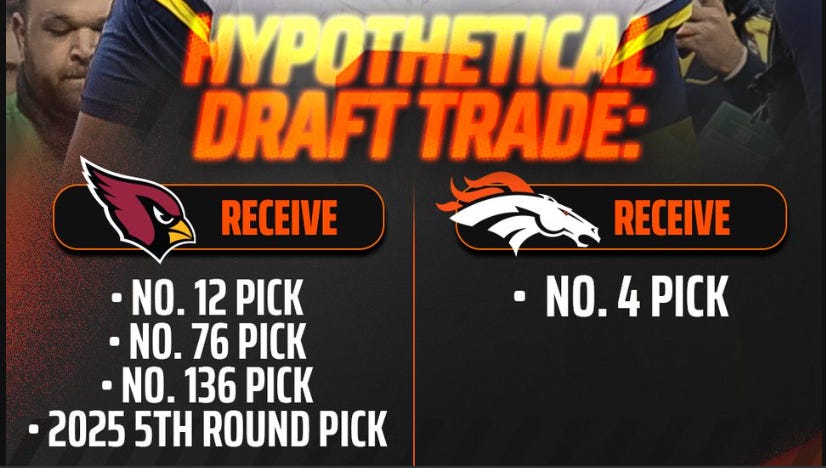 Caleb Williams is going number 1 overall to the Bears. That much we know. The Commanders will also be taking a quarterback at number 2, most likely Jayden Daniels. Drake Maye will likely go at number 3, either to New England or a team trading up to that spot leaving the Cardinals at 4, with MHJ on the board. But. Also on the board will be presumptive QB4, JJ McCarthy. Let’s set-aside whether JJ McCarthy is worthy of a top-5 pick (he’s not), he’s been linked with, among others, the Vikings (Pick 11), the Broncos (Pick 12) and the Giants (Pick 6) and the only way, in this scenario, that one of these teams will be guaranteed to select McCarthy is if they trade up with the Cardinals to Pick 4. All of this is true. With this in mind, if I see another ‘Hypothetical Draft Trade’ like this one I will walk into the ocean like a Derrick Henry touchdown run; swiftly, efficiently and with no small amount of force.